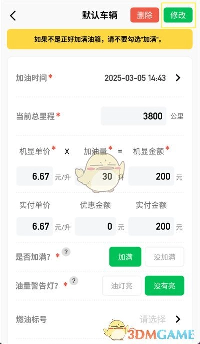 2. 当进入加油详情界面后,点击你想要修改的数据,接着点击该数据后方的修改按键。