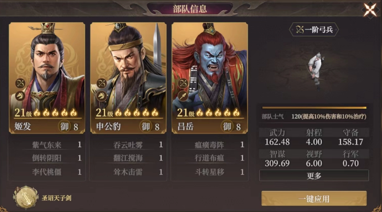 弱水弓配置:武将选择姬发、申公豹以及吕岳。这三位武将属性加点全部侧重于智力。