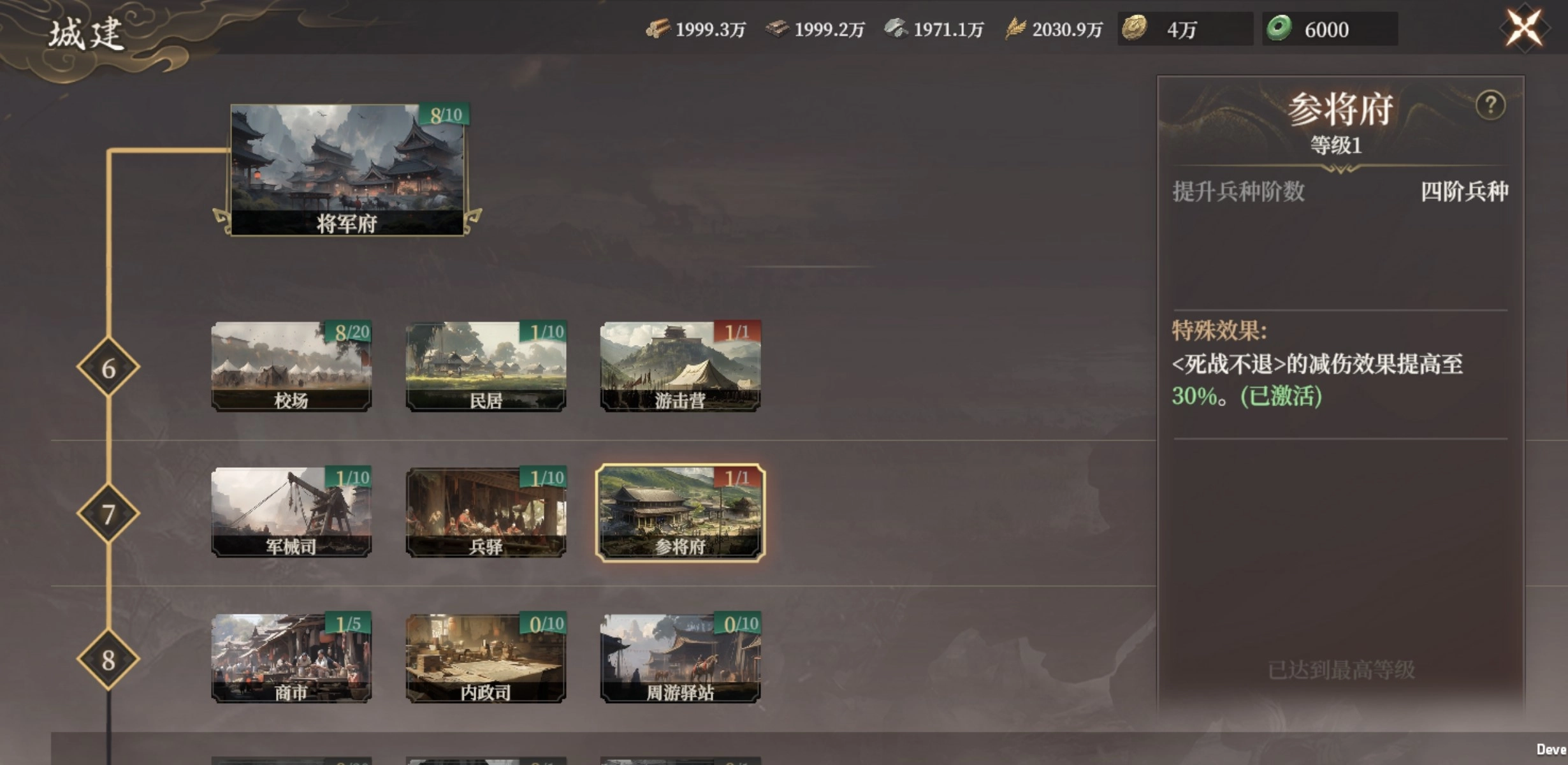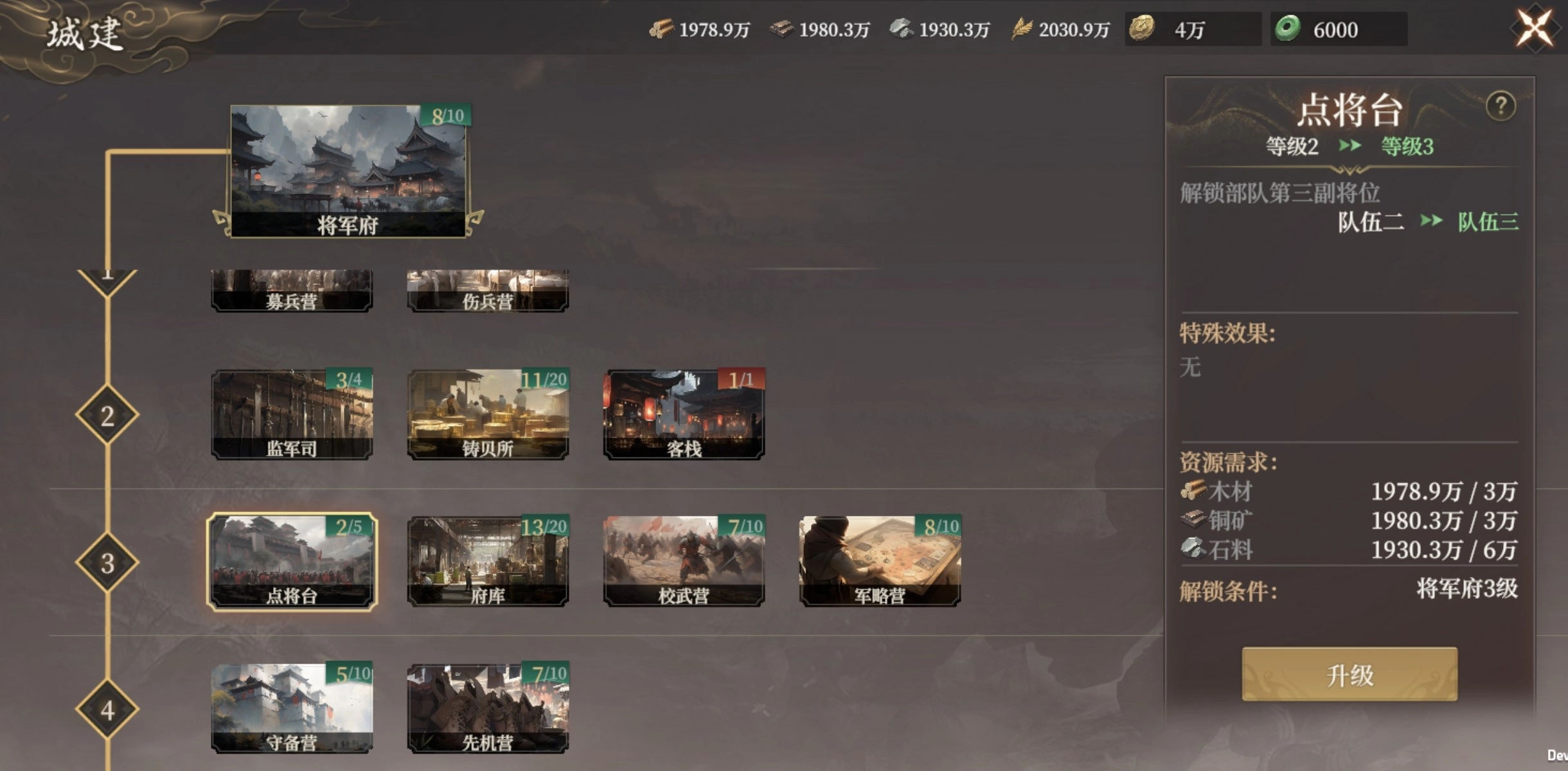 将军府升级至7级,解锁参将府、军械司。