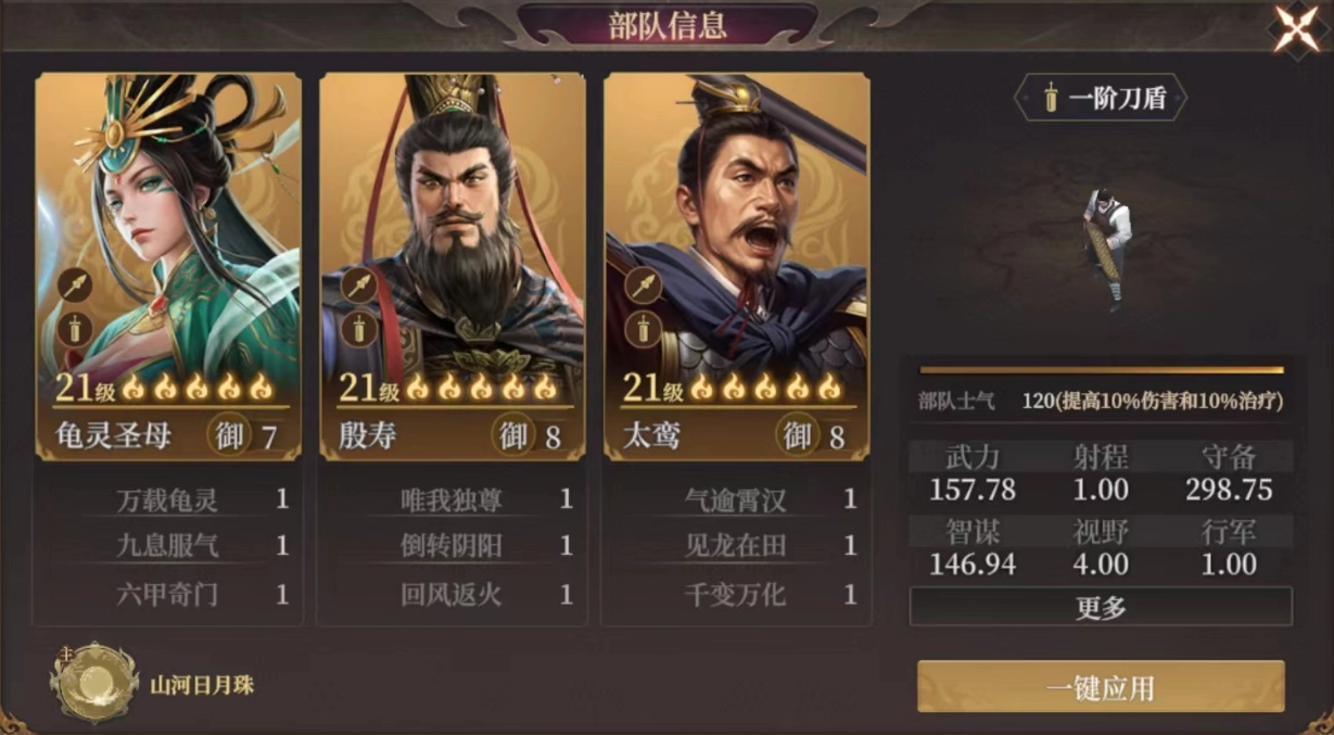 龟灵圣母前排抗伤,太鸾提供智谋减伤,殷寿自带术法在三、四回合施加全体回血,提升队伍续航能力。若敌方以武力伤害为主,太鸾可换成妲己。