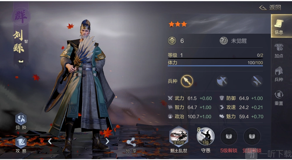 建议前期用满红的蓝将,三星满红能获得额外30点属性,入手轻松且性价比高,推荐刘繇、阚泽、王烈,这些都是政治属性高的武将。
