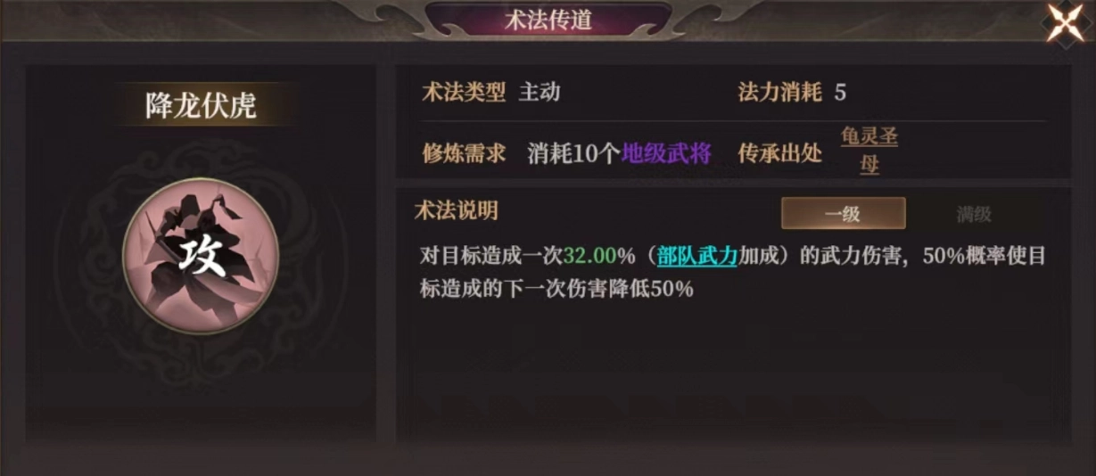 在造成伤害的同时,有50%的几率让目标下一次受到的伤害降低50% 。当缺乏鞭山移石、崩山碎石、巧夺灵魄这类武力伤害系术法时,能够用降龙伏虎来替代。