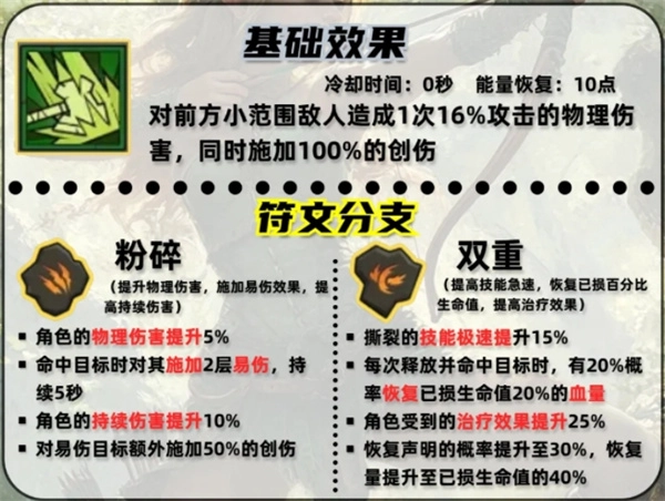 应用说明:撕裂技能所附带的物理伤害与持续伤害效果可直接加成“创伤”伤害,是痛割流打出爆发的关键一环。